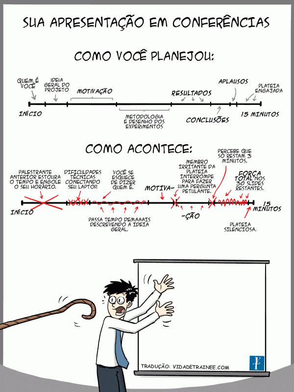 Hoje eu irei apresentar uma palestra sobre Planejamento de Carreira no evento Papo de Universitário. Eu só espero que a minha apresentação não seja tão cheia de contratempos como a da tirinha…