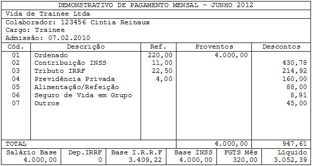 Pensando nisso, criei um demonstrativo de pagamento (também chamado de holerite ou contracheque) fictício explicando como funcionam todos os descontos, tais como INSS, Imposto de Renda e FGTS.