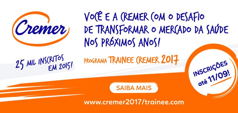 Presente em mais de 85% dos hospitais brasileiros, a Cremer é a maior empresa brasileira de produtos voltados para as áreas de primeiros socorros, cirurgia, tratamento, higiene e bem-estar. A empresa está com inscrições abertas para a 4ª edição de seu programa de trainee.