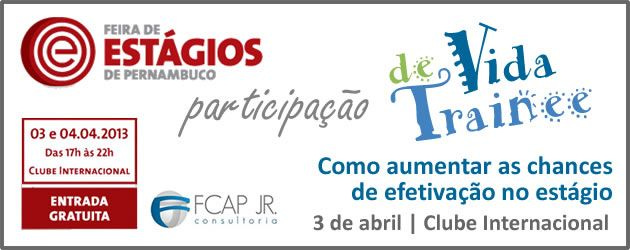 O ano continua recheado de novidades no blog. Depois do lançamento da nossa ferramenta avançada de busca de vagas, o mês de abril também será marcado pela presença do Vida de Trainee na Feira de Estágios de Pernambuco, evento que deverá reunir cerca de 15 mil estudantes!