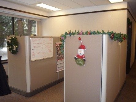 Essa foto representa o meu Natal de 2008. Na época, eu estava trabalhando no Canadá. A imagem mostra o meu cubículo todo decorado, com direito à neve do lado de fora. Foi o meu primeiro Natal longe de casa, mas foi também um momento de minha vida em que eu estava realizando o sonho de viajar para o exterior.
