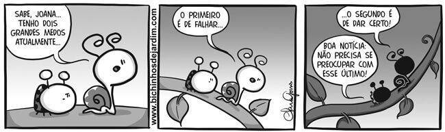 Seja como for, o fato é que a Joana, personagem da tirinha, está certa: enquanto você não acreditar em si mesmo(a) e não reunir a coragem necessária para superar os seus receios, não terá a menor chance de ser bem-sucedido(a).
